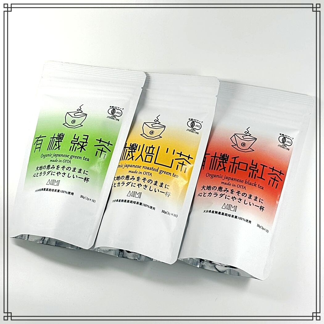 有機緑茶・有機ほうじ茶・有機和紅茶の3種セット商品です。